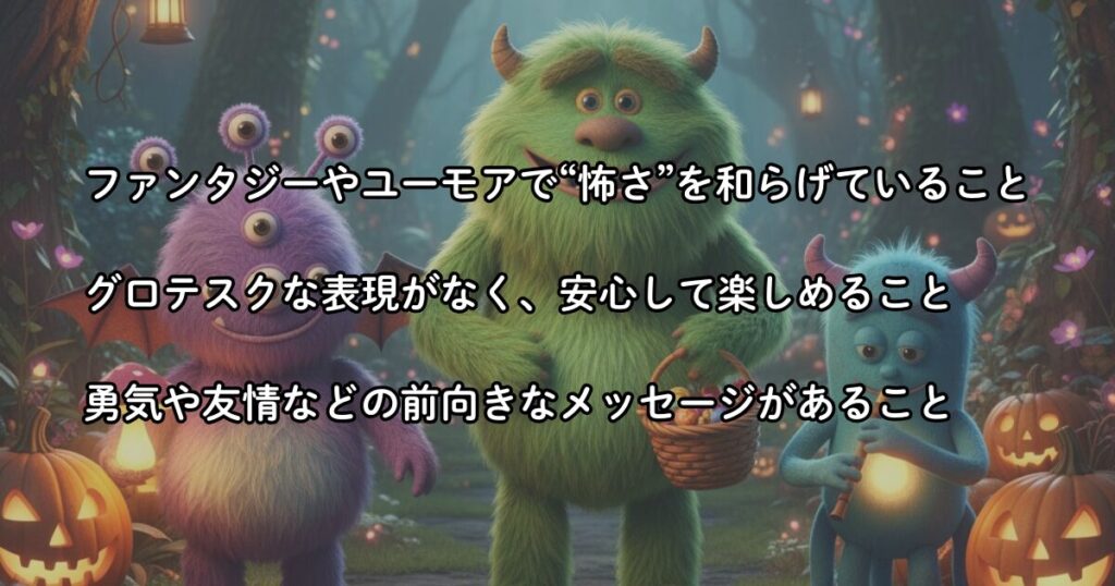 小さい子供でも安心して観られる内容で、ホラー的なドキドキを体験しながら笑顔で観終えることができます。初めての“モンスター映画”としてもおすすめです。